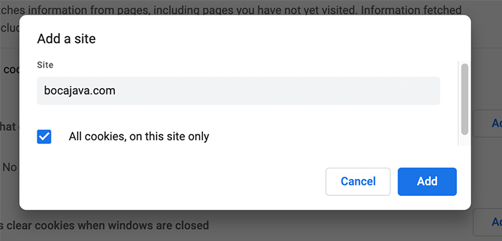 7. Enter bocajava.com under "Site", check "All cookies, on this site only" and click "Add".